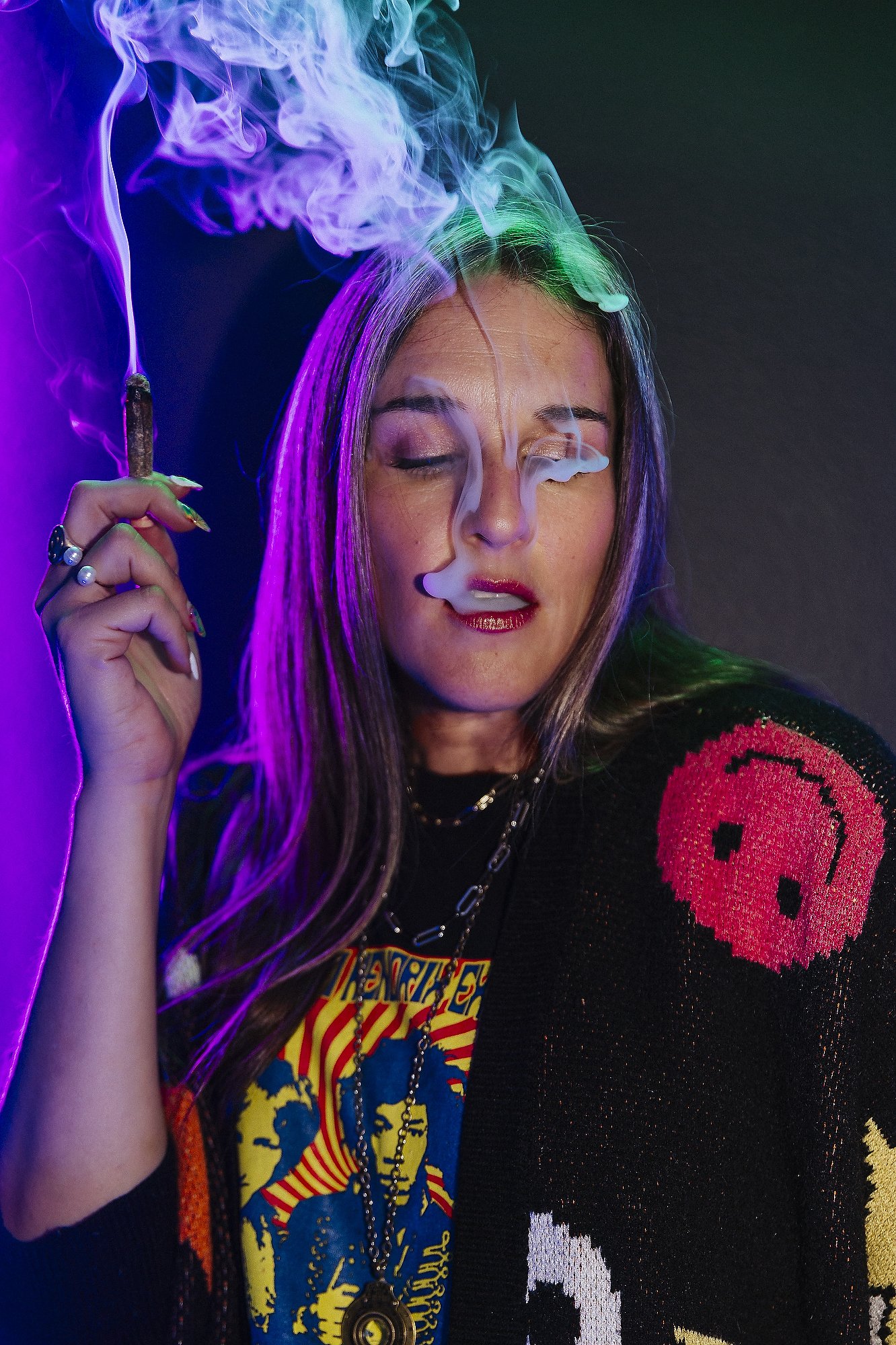 She’s best known for Puff Portraits™, her trademarked series capturing people mid-exhale, turning smoke into art and unsuspecting subjects into icons. What started as a “what if?” turned into an experience, a movement, and—yes—gallery walls.